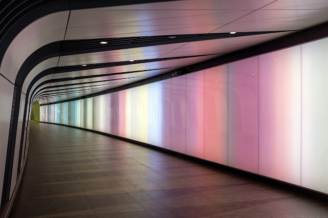 90m pedestrian tunnel between the King's Cross / St Pancras underground station and an exit at One Pancras Square. Architects: Allies & Morrison, LED light wall concept by Speirs & Major with design and implementation by The Light Lab. London Borough of Camden.
